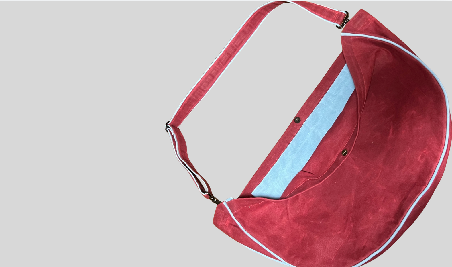 The waxed canvas material adds durability and helps maintain the shape of the design. Through wear and tear the waxed materials creates lines where the fabric has been folded which mimic the cracks seen on the buildings in Havana. Gunmetal is the most prominent metal used in Cuba hence its use for the hardware throughout the bag. Neoprene sponge was used in the base of the bag to further support the shape/structure of the design and add protection to the contents in the bag.Dualplex Neoprene Sponge foam rubber roll adhesive (1/16” thick)Gunmetal : oval slide buckle, magnetic snap,snap hooks, d ring loop, Inner o ringDUrawax, light waxed canvas cotton duck12 oz. steel blue 57” fabricDUrawax, light waxed canvas cotton duck12 oz. red 57” fabricColor Inspiration